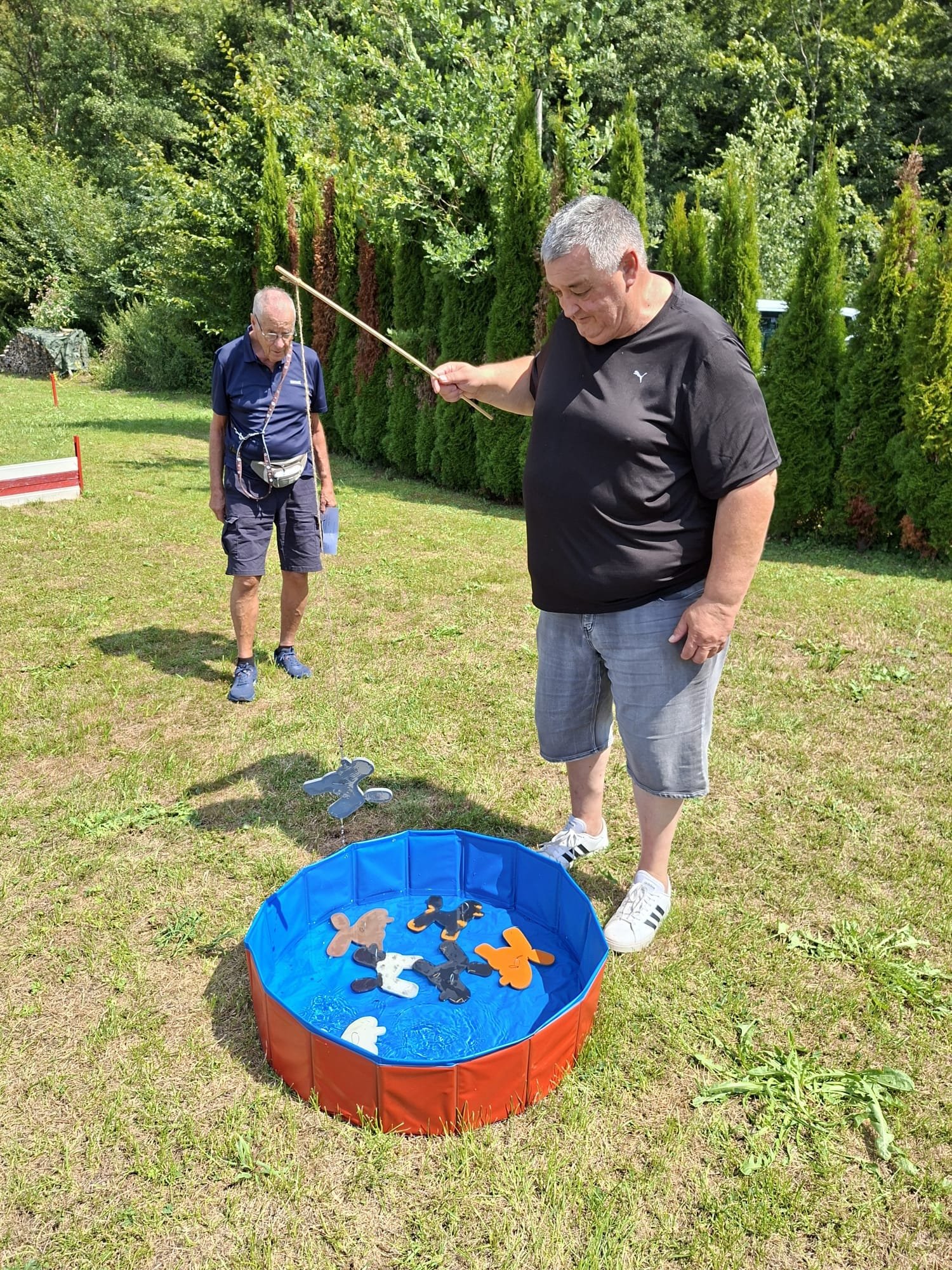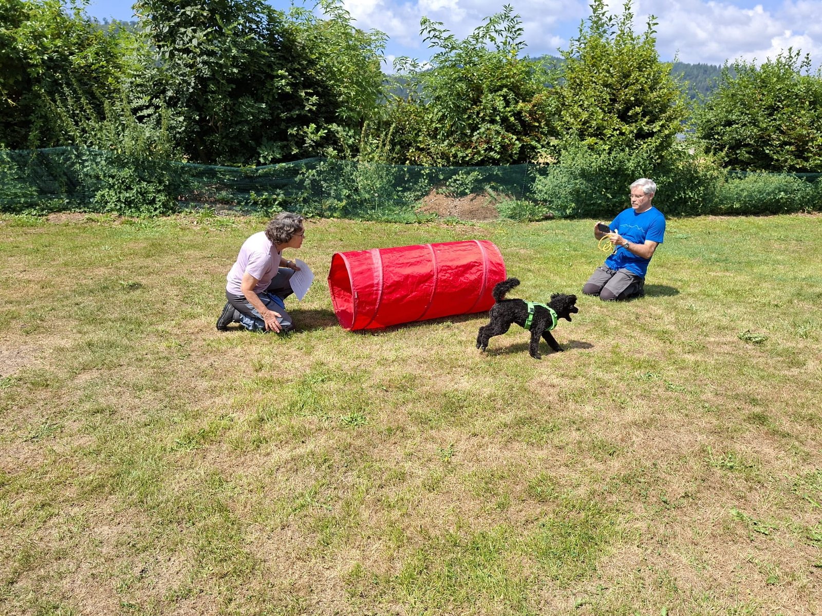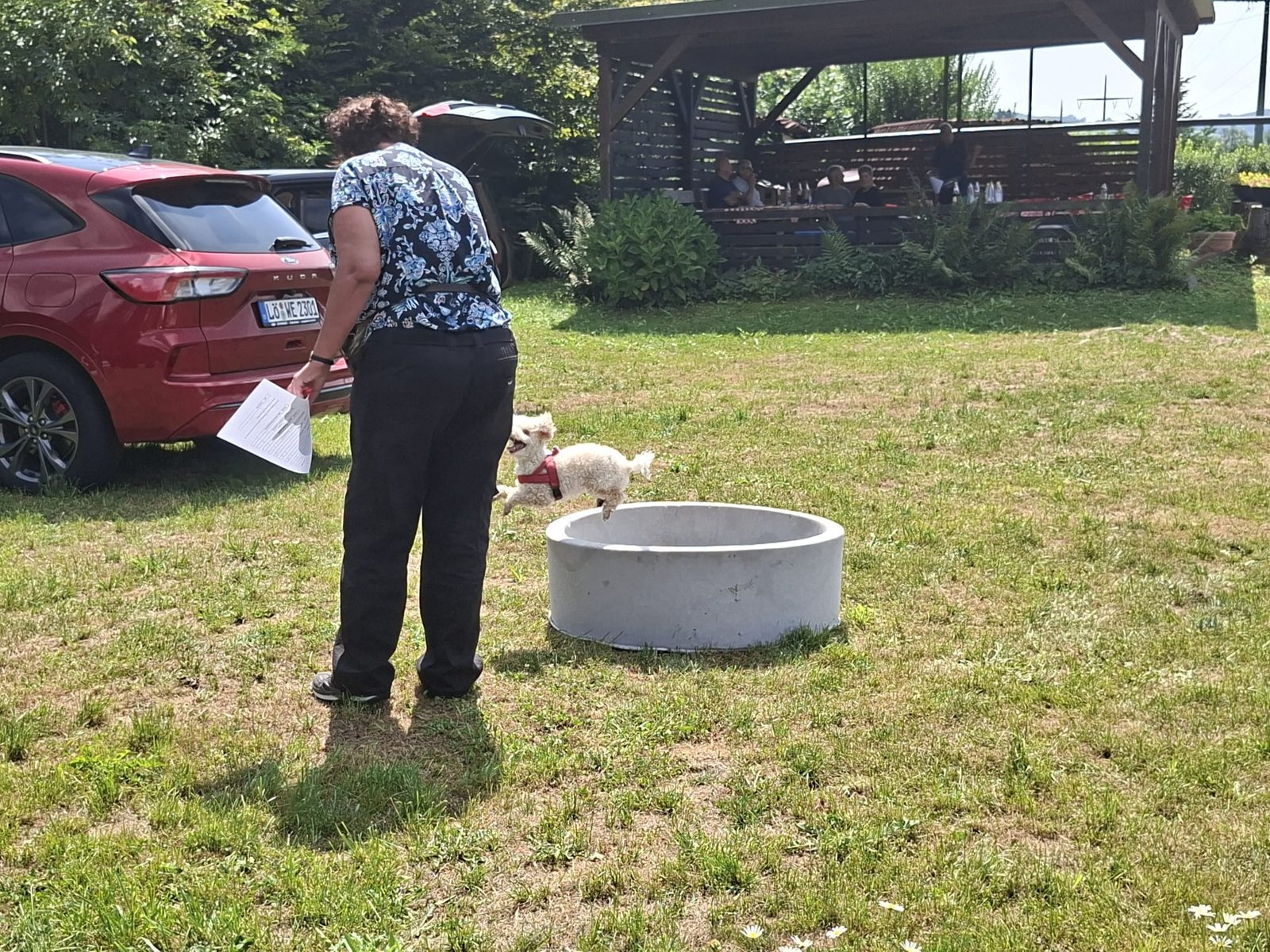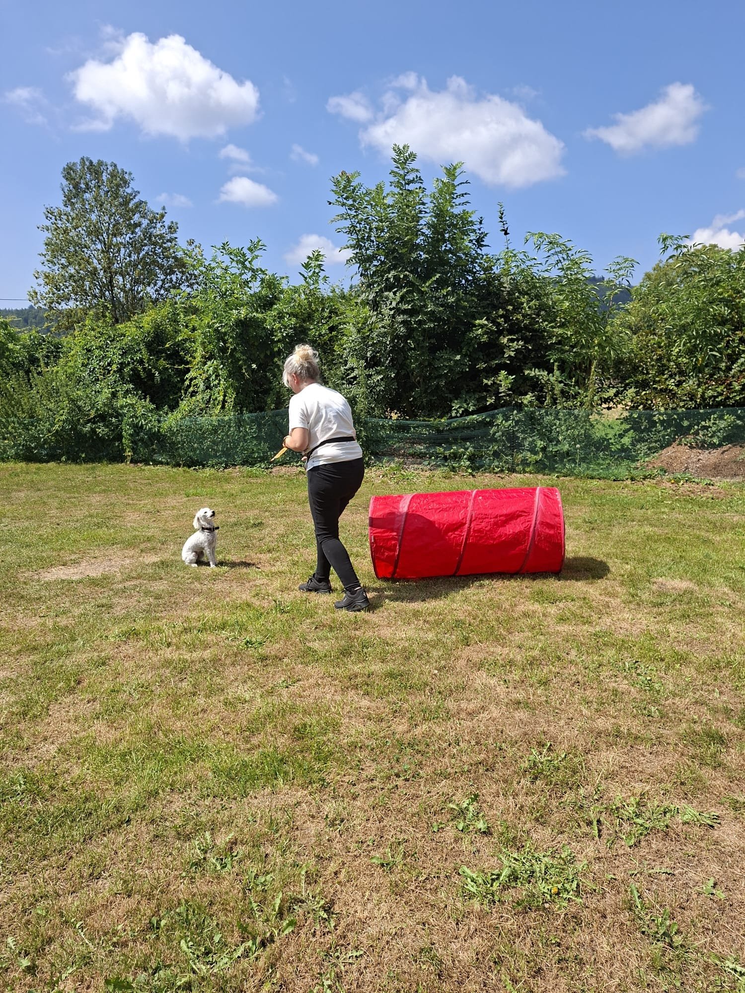 Mit einem Lächeln 😄 (und manchmal leichtem Zungenschnaufen 😅) meisterten Hund und Mensch die Stationen: Mal flitzte der Pudel durch den Tunnel 🌀, mal musste das Herrchen seine Zielsicherheit beim „Holzpudel-Abwurf“ 🎳 beweisen. Hindernisse, Sprünge und jede Menge Spaß – und das alles unter großem Gelächter 😂 der Zuschauer.